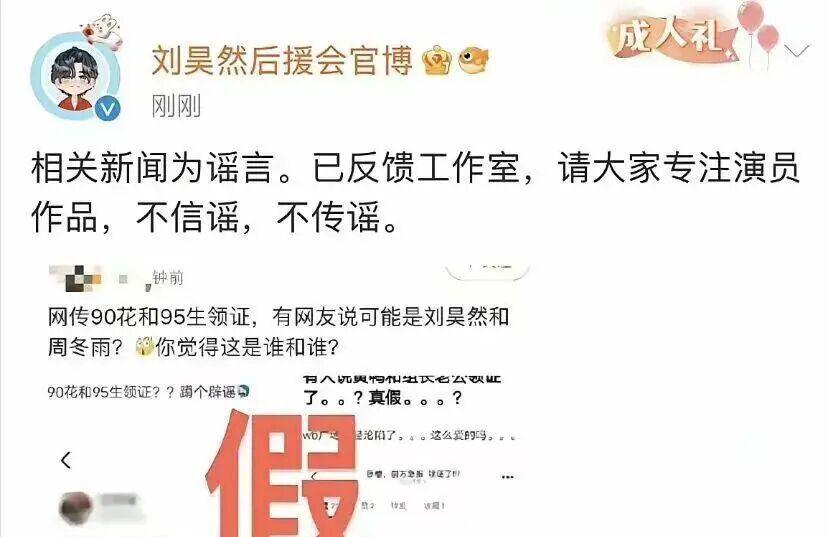 同年,网络上开始疯传两人已经领证结婚,这次刘昊然后援会紧急发布声明,称婚讯为谣言,但仔细看会发现——否认只是“领证”,对恋爱关系本身却含糊其辞。